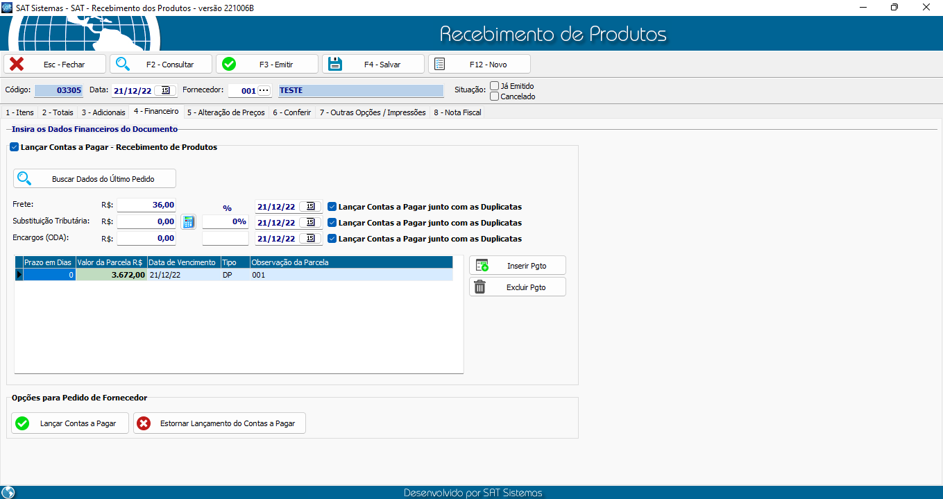 • Lançar contas a pagar- Recebimento de produtos